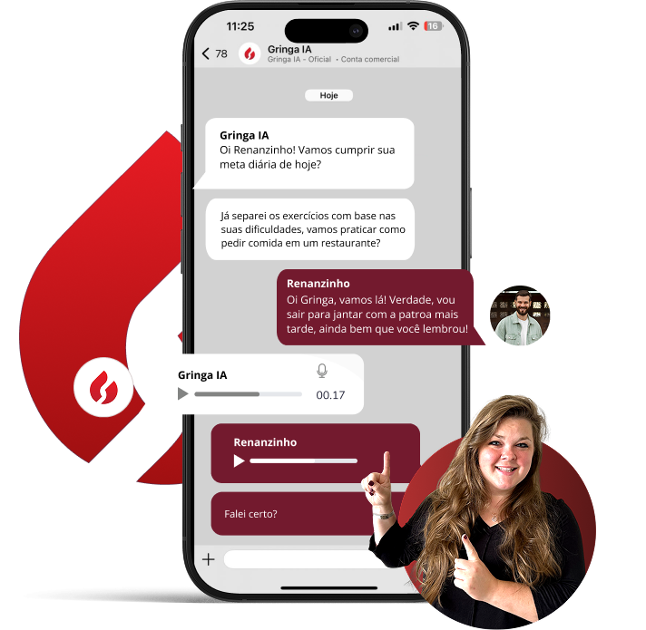Teste a Gringa IA completamente sem riscos. Converse com a IA, pratique inglês, receba correções instantâneas, veja os primeiros resultados.